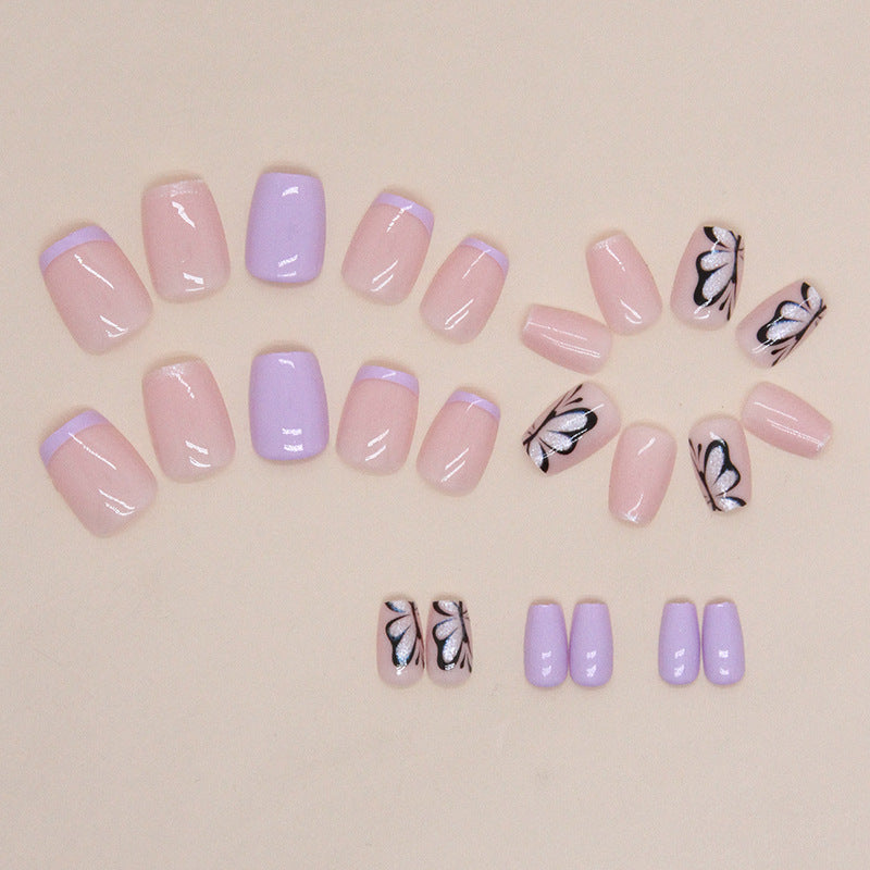 French Manicure Set, Pink and Lavender with Butterfly Design, Short Square Style, Press-on Nails